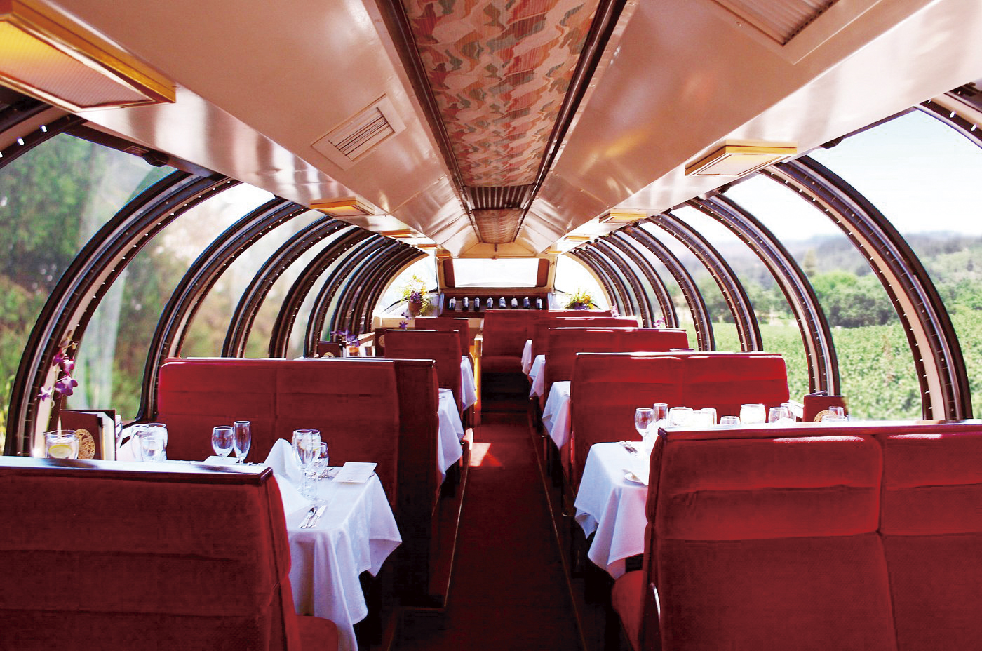 ↑列車内の食事は、全て車内の厨房にて調理。地元の新鮮な食材とシェフの技で本格的なカリフォルニアスタイルの料理が供され、まさに動く高級レストランです。