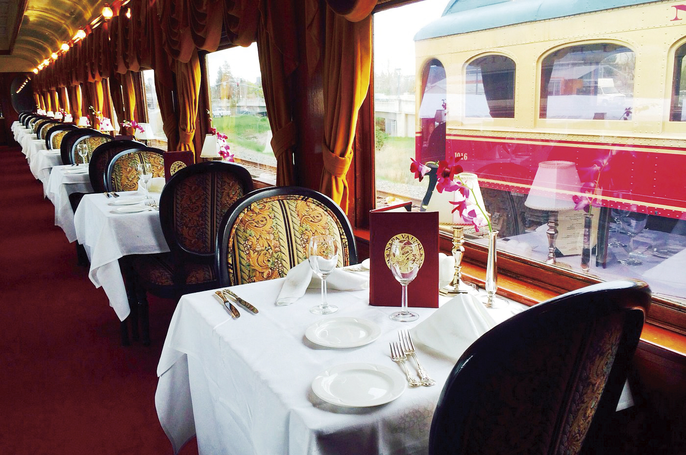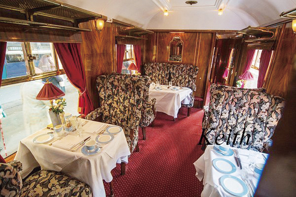 豪華な食事をとりながら優雅に走るベルモンド・ブリティッシュ・プルマン。