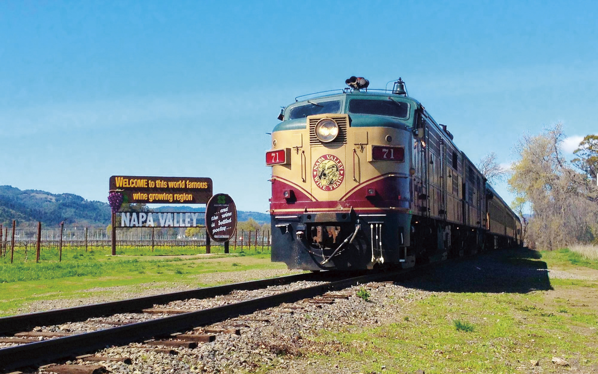 ↑ナパのダウンタウンから北のセントヘレナまでの往復60kmの道のりを、時速30kmでのんびりと走る観光列車。ワイントレインは1989年より運行しています。