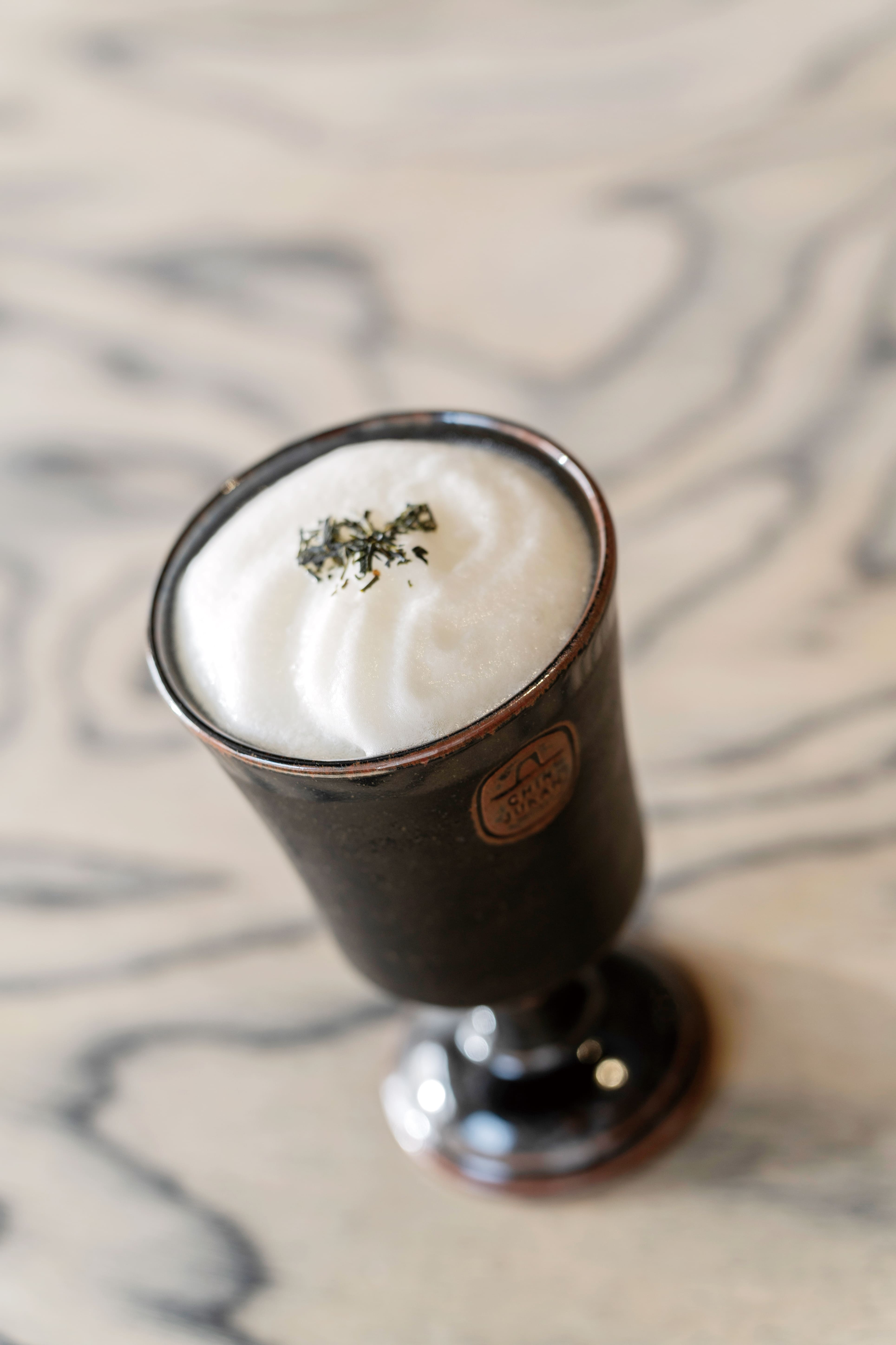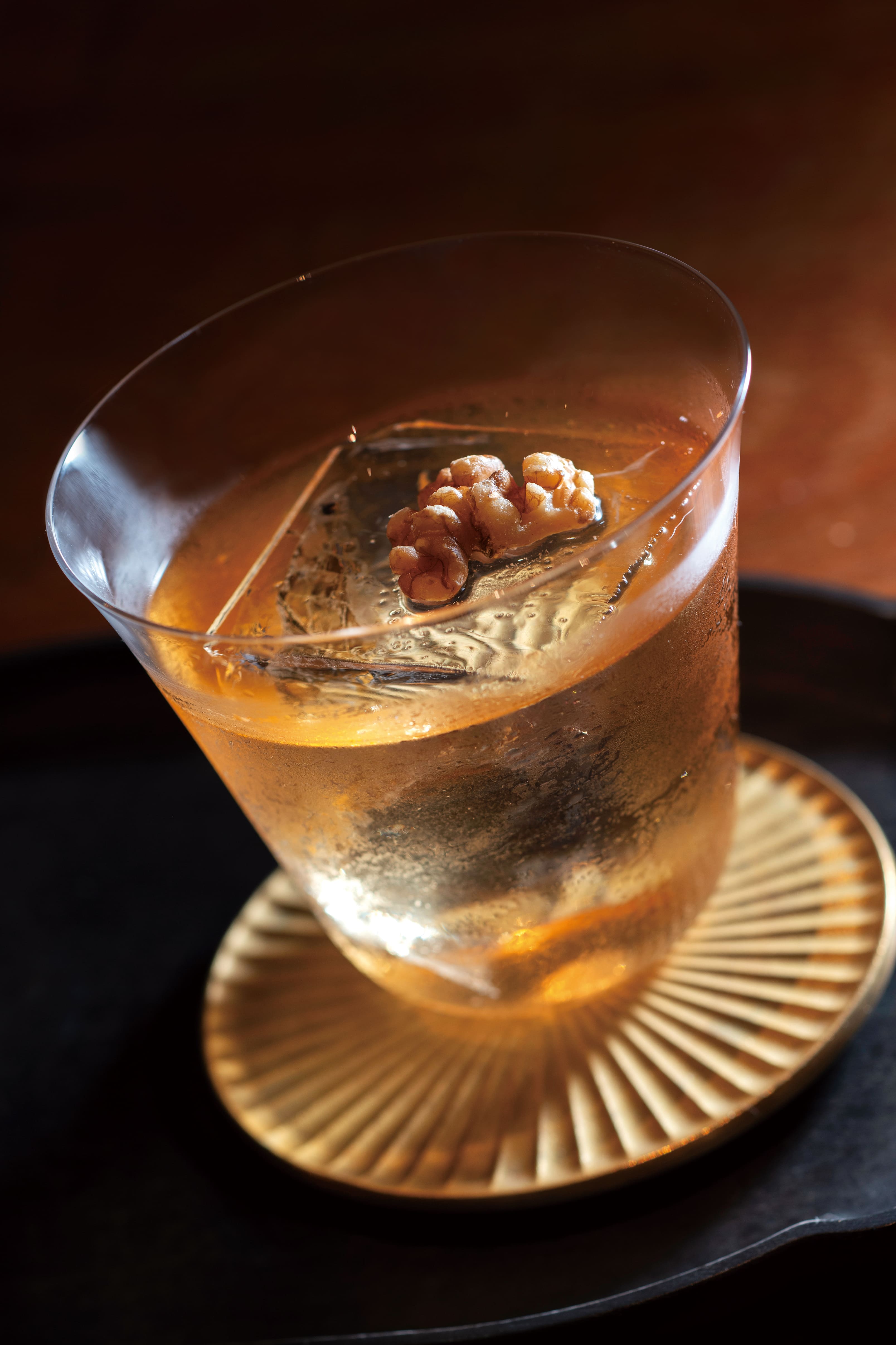 ↑ネグローニを麦焼酎でアレンジした「クリーミーナッツ」も人気。麦焼酎をベースに、ピーナッツバターの香りのするウォッカ、カンパリ、スイートベルモント、さらに生クリームを加え、コーヒーフィルターで濾すと透明な液体になる。