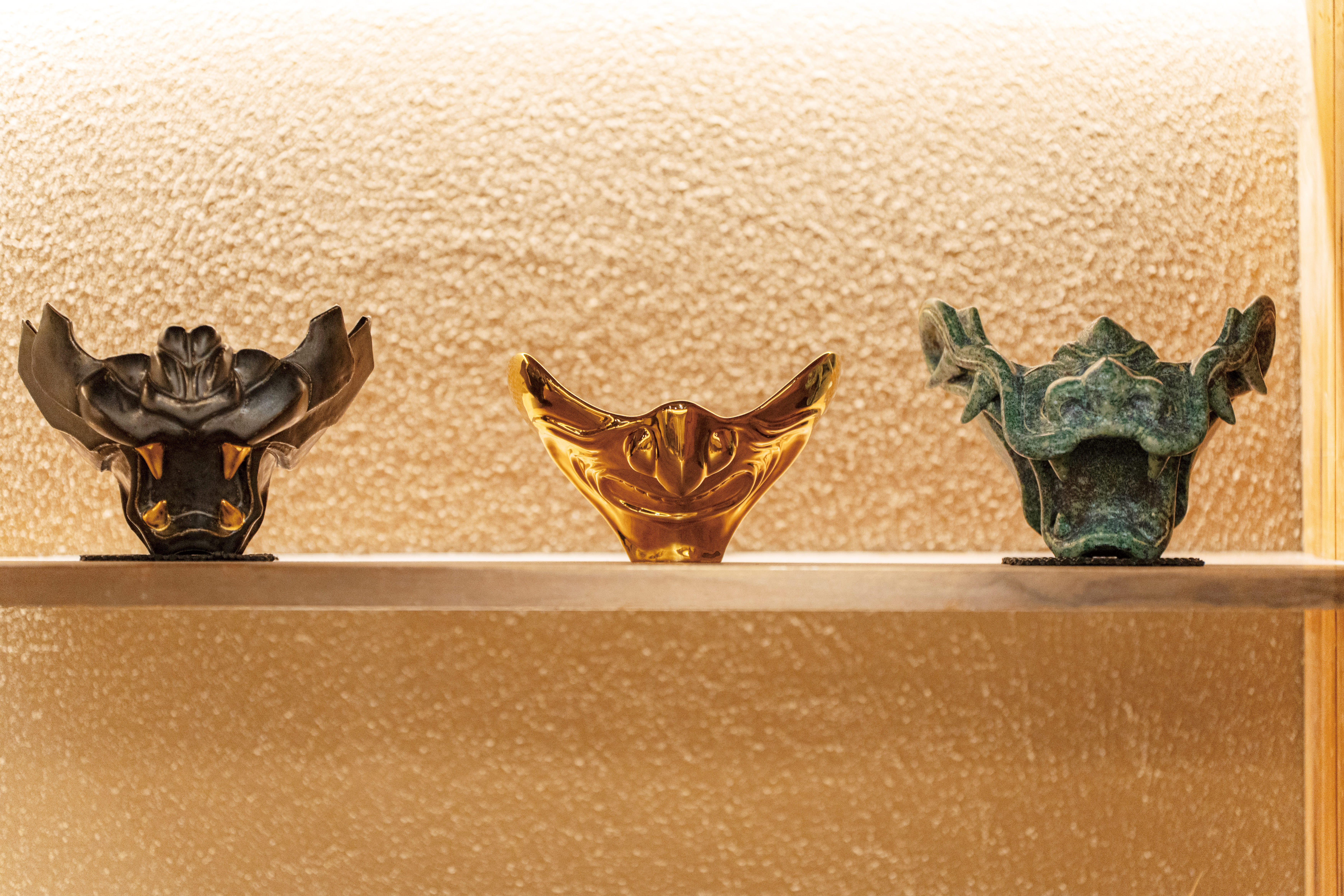 ↑南雲氏が惚れ込んでコレクションしているという、陶芸家・古賀崇洋氏の茶器。この形の器で飲むとマスクのようになることから、頬鎧盃(ほおよろいはい)と名づけられている。