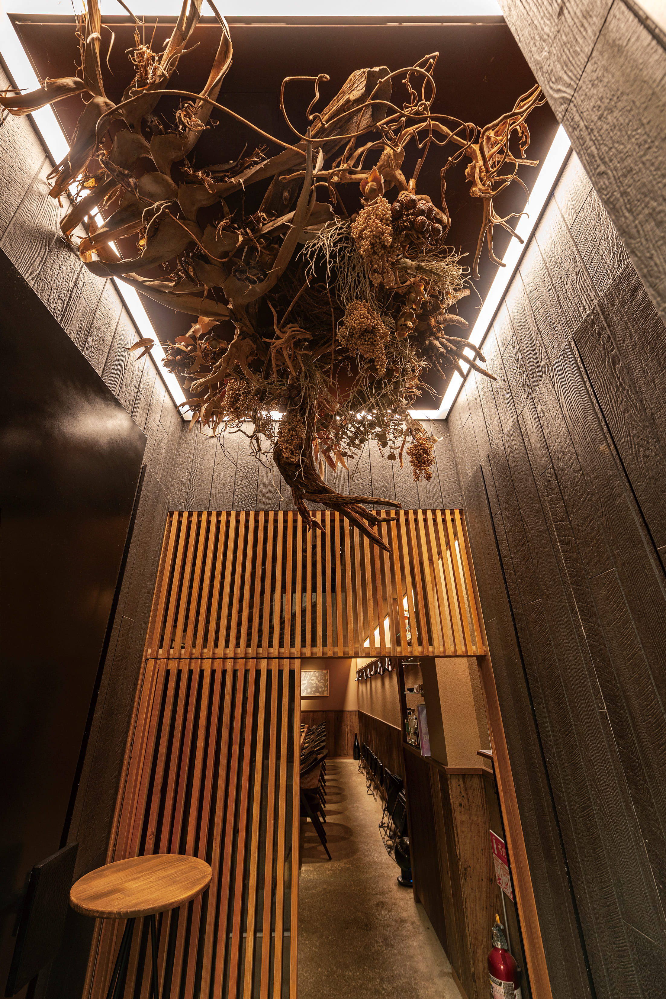 ↑「FOLKLORE」の店内は、歴史ある寺院に使われていた木材など、自然素材を使った内装が施されている。凛としつつも穏やかな空気が流れ、まさに茶室のような空間。