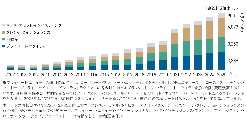 ブラックストーンは運用資産残高約1.2兆米ドル超(約173.8兆円超*)を誇る世界最大級のオルタナティブ投資運用会社です。1985年の創業以来、プライベート・エクイティや不動産、プライベート・クレジットなどの分野で業界をリードしてきました。