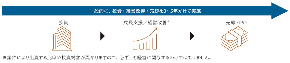 プライベート・エクイティ投資とは、主に非上場企業の株式に投資を行い、主体的に成長支援・経営改善を行うことにより、投資先企業の企業価値の向上を通じて、中長期的にキャピタルゲインの獲得を目指す投資手法です。